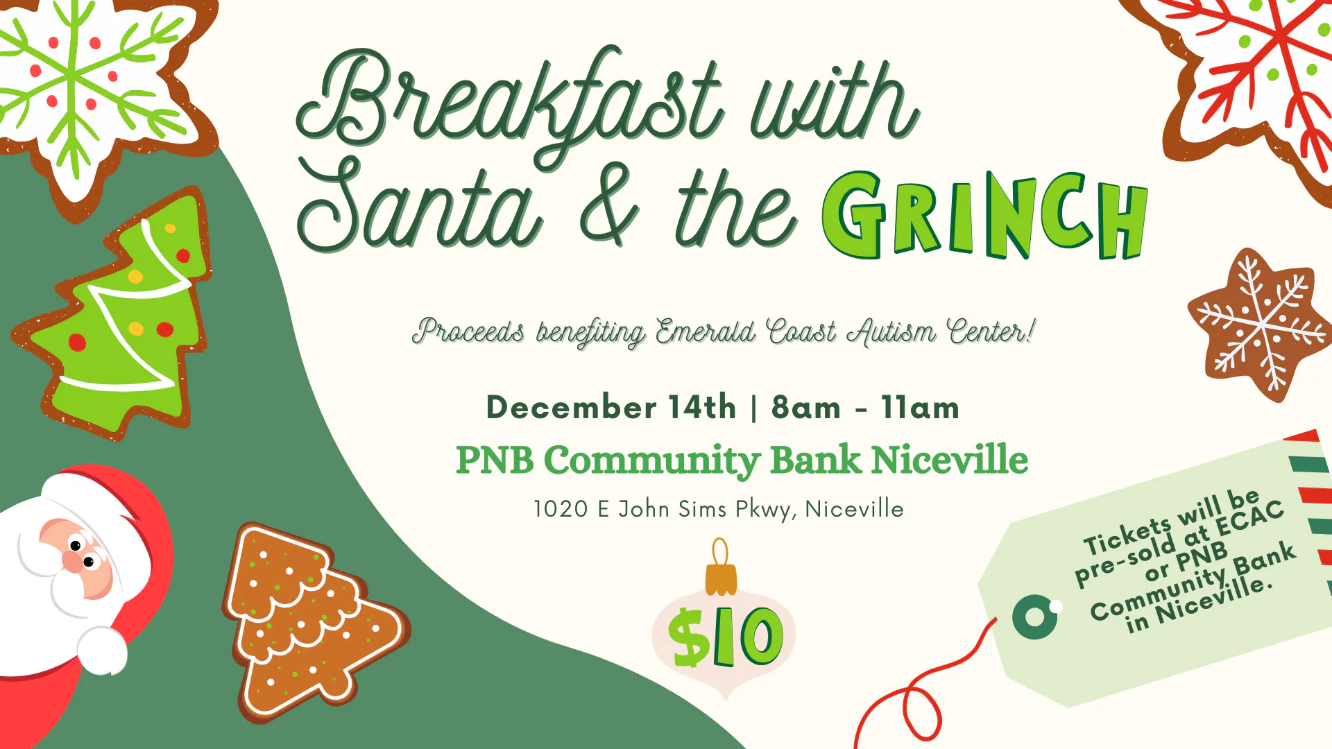 - $10 - proceeds benefitting ECAC. You may purchase tickets at Emerald Coast Autism Center or PNB Bank in Niceville.